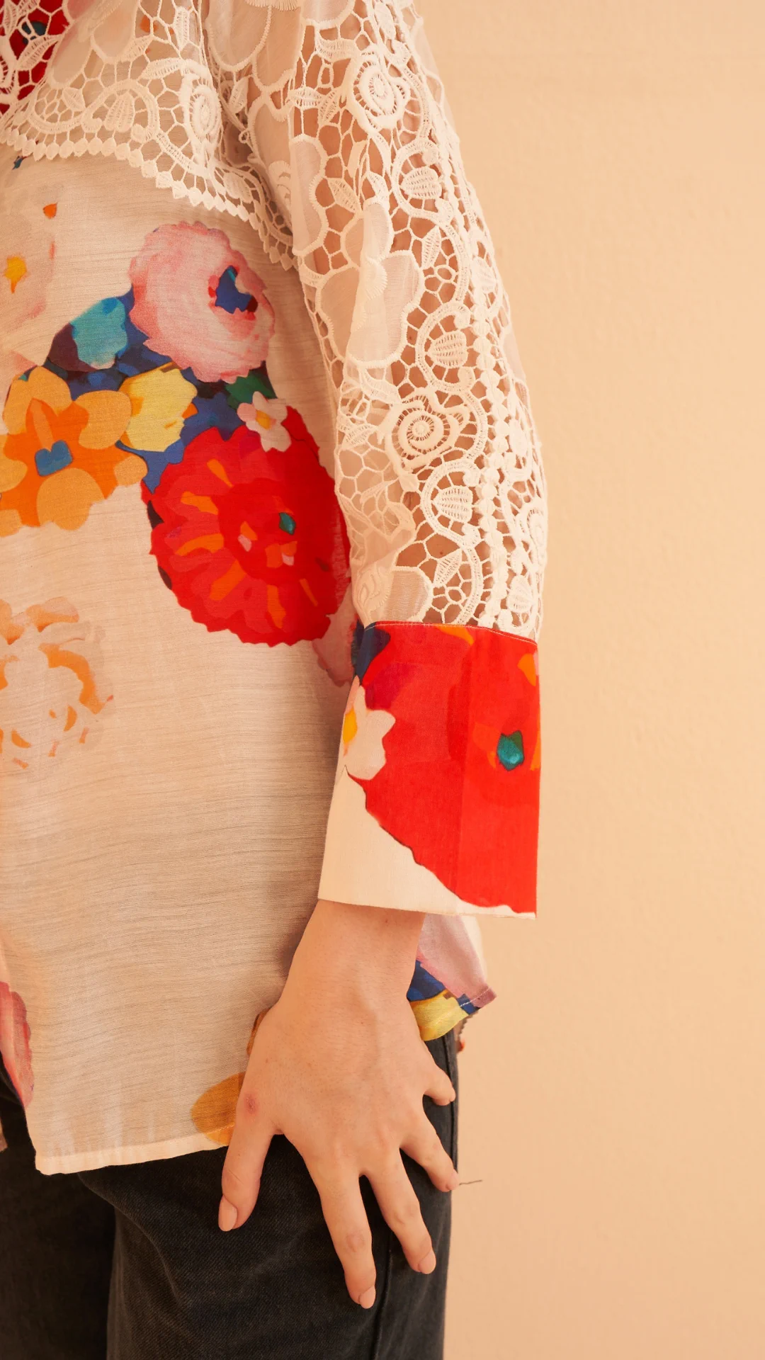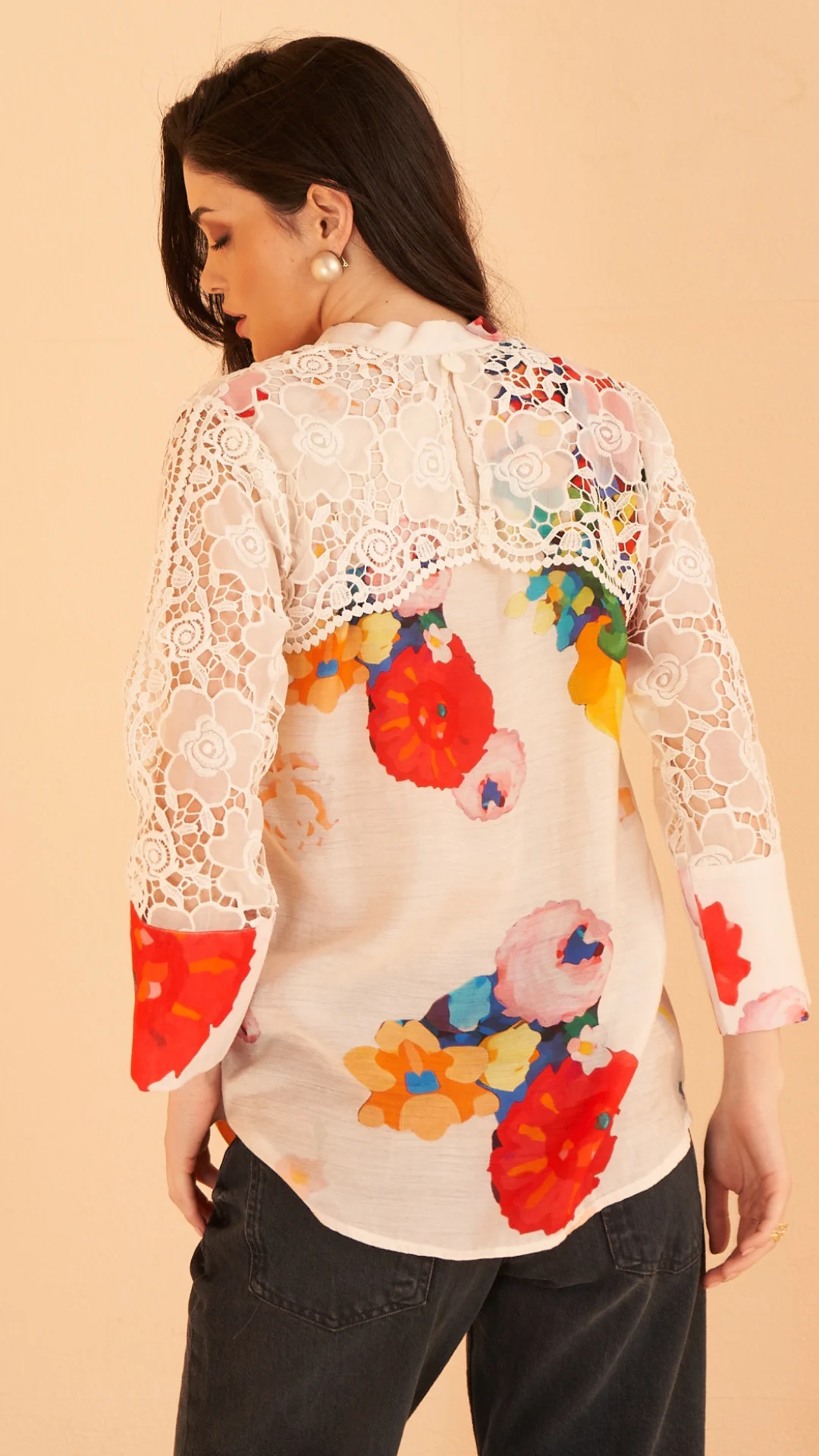 Spun Chanderi Digital Print shirt with crochet layering over the front yoke, back and cuffed sleeves