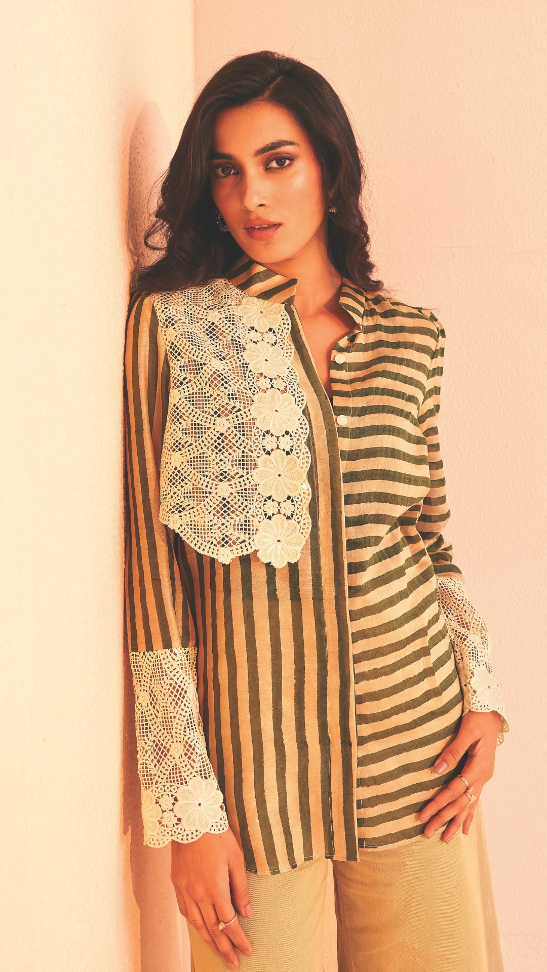Mull Chanderi Hand Block printed shirt with crochet embroidery on front right side and sleeves, with beautiful lace detailing in the back